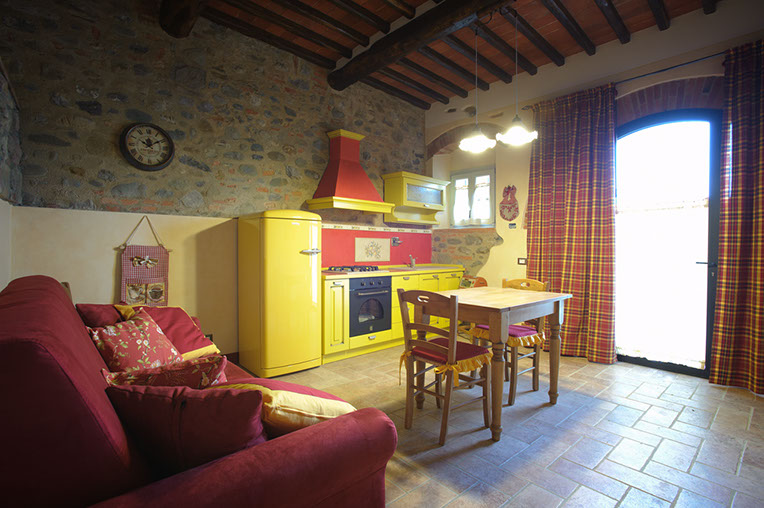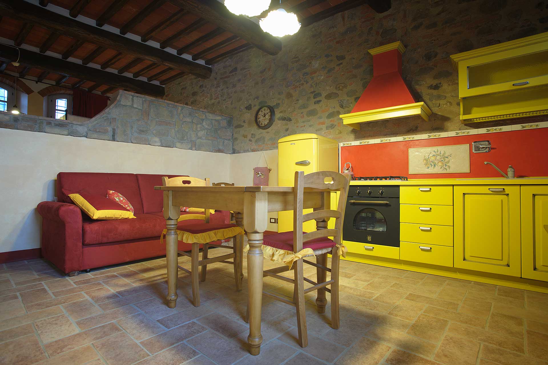 Appartamento/monolocale composto da una camera da letto separata dalla zona giorno da una mezza parete, bagno privato, angolo cottura e zona pranzo con divano letto matrimoniale.