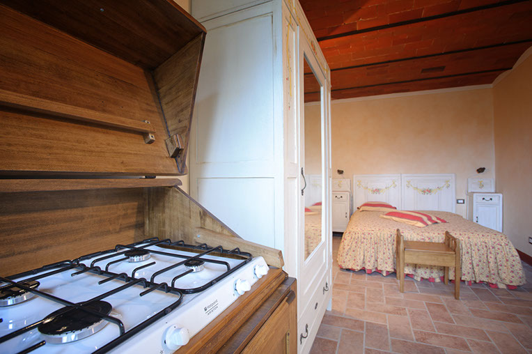 Monolocale a pianta aperta con bagno privato e angolo cottura.